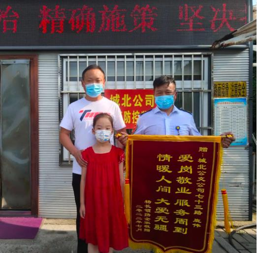 7月24日上午,市民張先生一家人專程來到楊山路調(diào)度室,將一面寫有“愛崗敬業(yè)、服務(wù)周到、情暖人間、大愛無疆”字樣的錦旗送到73路駕駛員鹿偉的手中,感謝他幫助迷路的孩子找到家人。