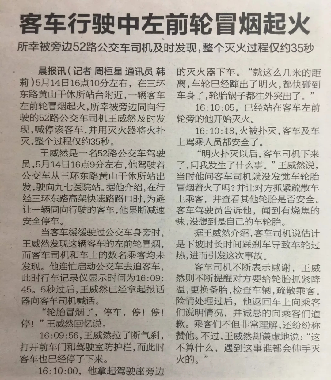 5月14日16點(diǎn)10分左右,在三環(huán)東路黃山干休所站臺(tái)附近,一輛客車(chē)左前輪冒煙起火,所幸被旁邊同向行駛的52路公交車(chē)司機(jī)王威然及時(shí)發(fā)現(xiàn),喊停該客車(chē),并用滅火器將火撲滅,整個(gè)過(guò)程僅約35秒。