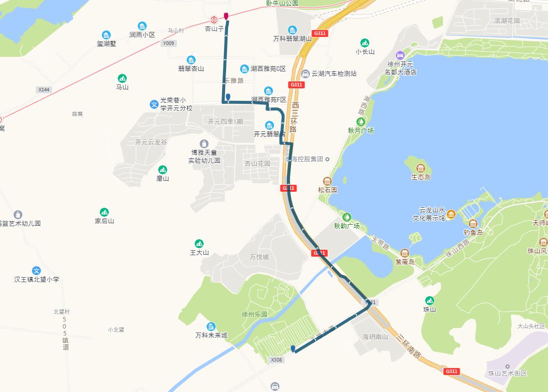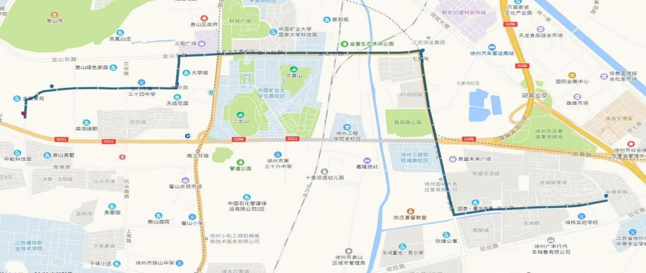 線路站點(diǎn):御景灣公交首末站、濱湖御景灣南門(mén)、姚莊街坊中心、欣欣路口、七里溝地鐵站、礦大北門(mén)、大學(xué)城、天成花園、三十四中、三十中附小、泉泰嘉苑、泉山美墅西門(mén)(路西,單向)、碧水灣小區(qū)(路北、單向)、泉山法院(路南,單向)。備注:因目前雙山路與三環(huán)南路交叉口正在施工,公交車(chē)輛無(wú)法通行,319路暫時(shí)僅運(yùn)行至泉泰嘉苑。待道路貫通后,進(jìn)行全線路運(yùn)營(yíng)。