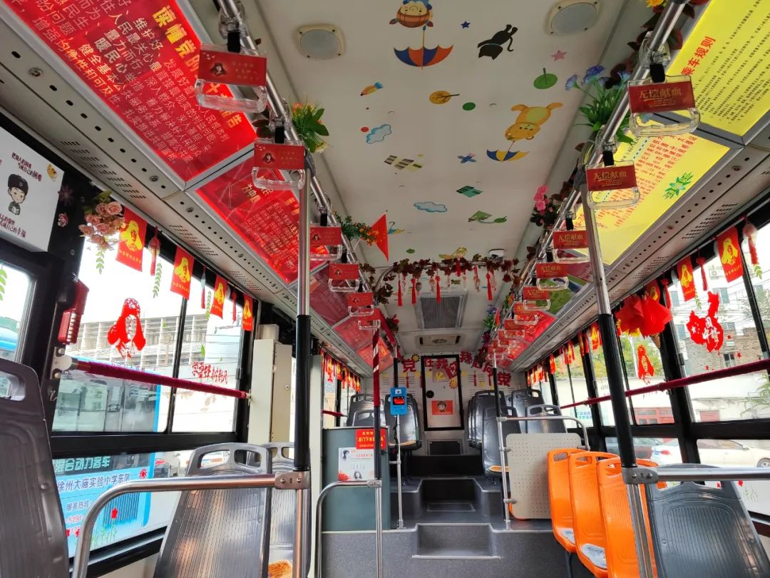50余輛主題宣傳車(chē)車(chē)廂內(nèi)以中國(guó)紅為主色調(diào),在扶手、廣告展板、車(chē)廂尾部等醒目位置布置了黨的二十大報(bào)告內(nèi)容,還對(duì)黨的二十大報(bào)告以“數(shù)”讀、一圖速覽的形式,尤其是對(duì)二十大報(bào)告里黨的中心任務(wù)等重要提法、二十大報(bào)告金句等內(nèi)容做了重點(diǎn)展示。一幅幅主題鮮明、引人入勝的宣傳展板呈現(xiàn)在市民乘客面前,方便公交職工在工作間隙、廣大市民在乘車(chē)途中充分利用碎片時(shí)間學(xué)習(xí)黨的二十大精神。此外,部分公交車(chē)上還配置了“便民服務(wù)箱”,備有應(yīng)急藥品、口罩、消毒濕巾等,以實(shí)際行動(dòng)踐行黨的二十大精神。
