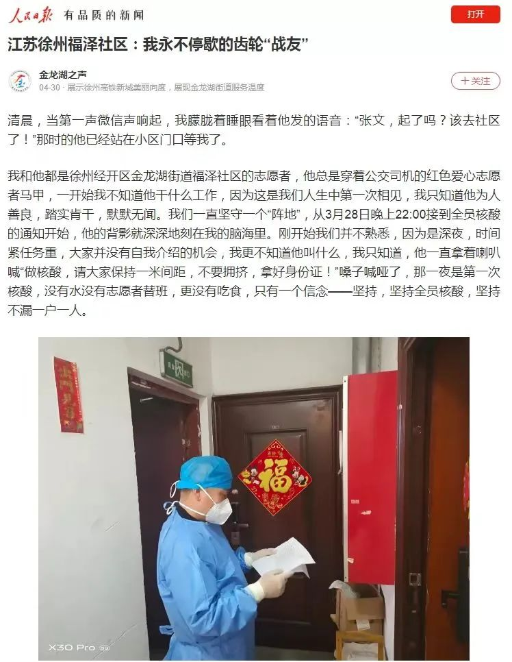 今年3月底,疫情在徐州蔓延,徐州公交停運(yùn)。鹿偉積極響應(yīng)號召,在經(jīng)開區(qū)金龍湖街道福澤社區(qū)做起了防疫志愿者,測溫、登記、消毒,只要是需要的地方都可以看到他忙碌的身影。在全員核酸檢測的進(jìn)程中,福澤社區(qū)部分工作人員因接觸密接人員而被隔離,志愿者便擔(dān)負(fù)起各個(gè)核酸點(diǎn)位的工作。從那時(shí)起,鹿偉便總是早晨第一個(gè)來,晚上最后一個(gè)走。全員核酸一輪接一輪,不管安排什么工作,他每天都如約而至,從不遲到,從不停歇。而他口中永遠(yuǎn)都只有一句話:“只要沒開工,我就天天干,開工了我就要上班去。”多么淳樸的一句話,簡潔明了,可是,卻無不透露著他內(nèi)心深處的干凈、純粹、無私、大愛、無怨無悔。很多人會(huì)問他為什么這么堅(jiān)持不懈,是什么讓他這樣干勁十足,他的回答一直都是:“我喜歡付出,我覺得這樣活得很踏實(shí)、很充實(shí),家里人也很支持我。”