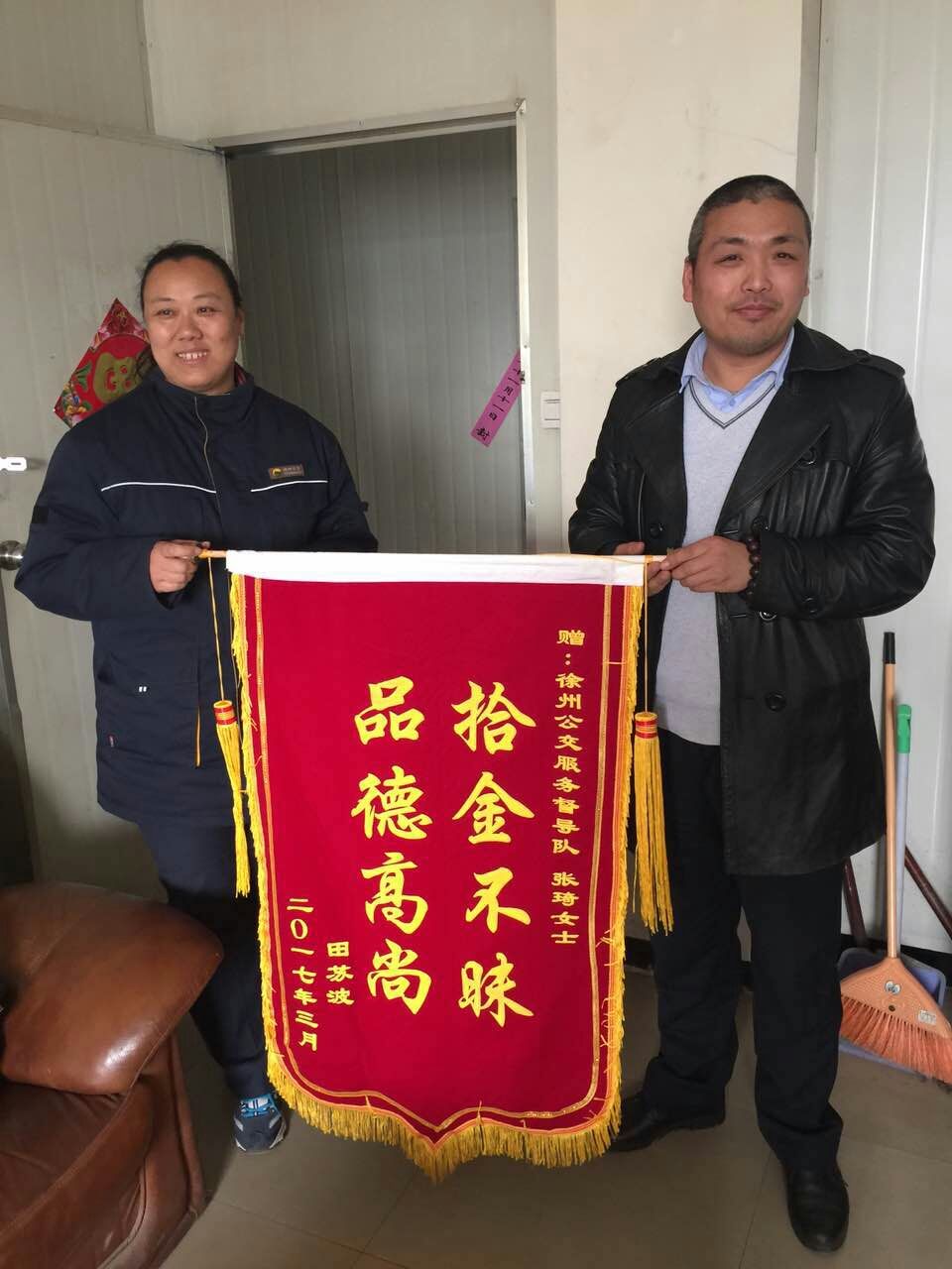 3月29日,正在站臺執(zhí)勤的督導員張琦撿到乘客掉落的公文包,經(jīng)查看發(fā)現(xiàn)包內(nèi)有蘋果筆記本一臺和一個錢包,但并沒有找到皮包主人的聯(lián)系方式。張琦把包放在了調(diào)度室等待失主來認領(lǐng),約一小時后失主匆忙趕來尋找。失主見到失而復得的皮包非常激動,經(jīng)過詢問得知失主姓田在徐州礦業(yè)大學工作。田先生說,“電腦里存有非常重要的資料和聯(lián)系方式,丟包之后萬分焦急,真心感謝公交督導員?!彪S即從錢包里拿出400元錢塞給張琦作為答謝,張琦表示:“路不拾遺本就是自己的義務(wù),作為站臺督導員經(jīng)常會在站臺撿到乘客掉落的物品,不管東西貴重與否我們都會幫失主妥善保管等待認領(lǐng)?!?/span>3月31日,田先生和他的愛人送來錦旗表示感謝!