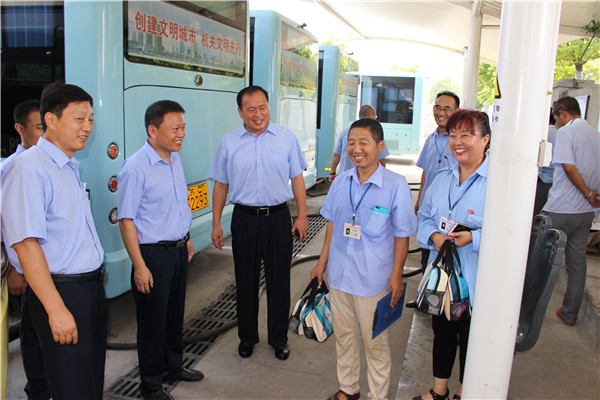炎炎烈日下,空調(diào)公交車成為市民出行首選。為給市民營造舒適、涼爽的乘車環(huán)境,各運(yùn)營公司應(yīng)用公交GPS智能調(diào)度系統(tǒng),科學(xué)調(diào)度、靈活排班、保證運(yùn)力充足。同時(shí),結(jié)合創(chuàng)建工作,提高服務(wù)質(zhì)量,全市2100多輛空調(diào)車全部開足冷氣;駕乘人員揮汗如雨堅(jiān)持“一趟一清掃”,認(rèn)真做好車輛清潔工作;督導(dǎo)隊(duì)員冒著高溫在各大站臺維持秩序、扶老攜幼、做好導(dǎo)乘服務(wù)、嚴(yán)查易燃易爆及危險(xiǎn)品。由于各項(xiàng)舉措落實(shí)到位,確保了高溫期間全市161條公交線路運(yùn)營順暢,乘客走好走了。(圖為董事長、總經(jīng)理杜紅軍,總經(jīng)理助理李修超一行在食品城充電站慰問堅(jiān)守崗位的充電員工。)