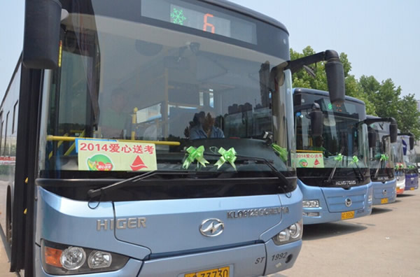一年一度的高考是社會(huì)關(guān)注的熱點(diǎn),每年這個(gè)時(shí)候,徐州的大街小巷都有這樣一個(gè)群體——送考愛(ài)心車隊(duì)。懸掛綠絲帶的送考車,成為城市道路上靚麗的風(fēng)景。今年,公司也加入到“愛(ài)心送考,算我一個(gè)”2014愛(ài)心送考公益活動(dòng)中,在66路、76路、65路、11路、608路等5條途經(jīng)考點(diǎn)的線路成立“愛(ài)心公交”送考專線。高考期間,考生憑準(zhǔn)考證可免費(fèi)乘坐這5條線路。為了給考生提供力所能及的幫助,駕駛員還在車上配備了方便袋、清涼油、創(chuàng)可貼等用品,以備乘客不時(shí)之需。圖為“愛(ài)心送考”啟動(dòng)儀式現(xiàn)場(chǎng)。